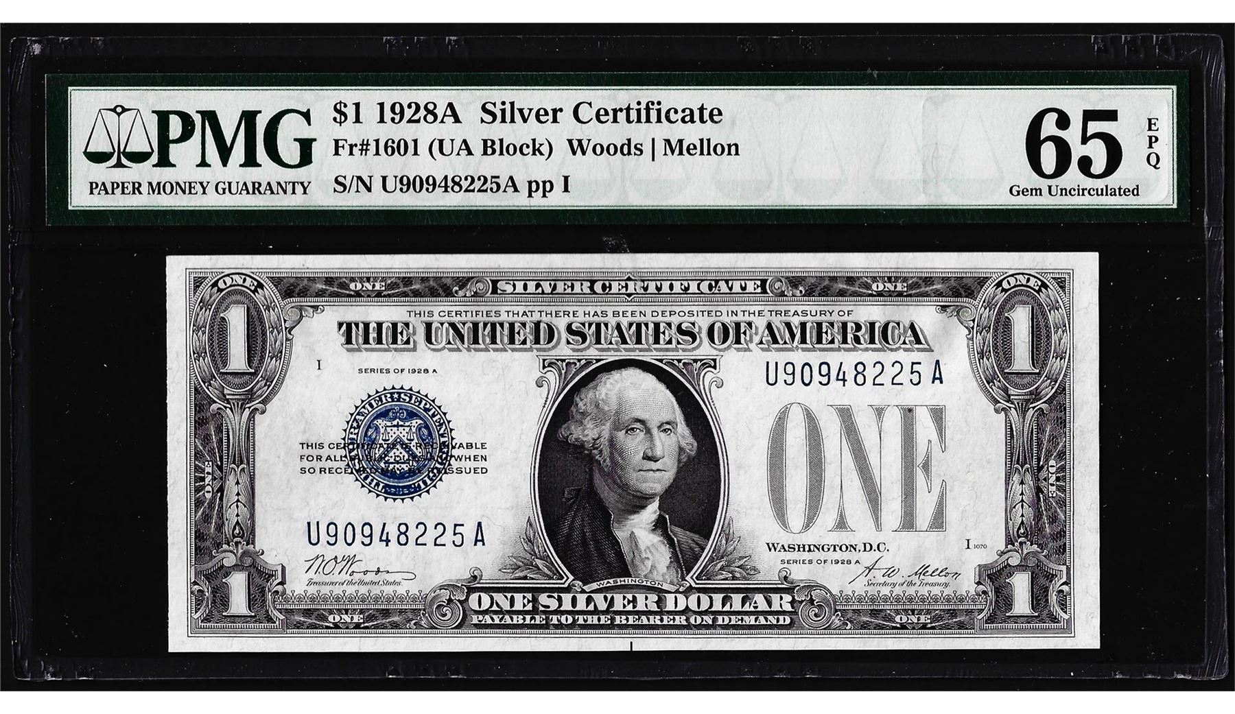 1928A $1 Silver Certificate Note Fr.1601 PMG Gem Uncirculated 65EPQ