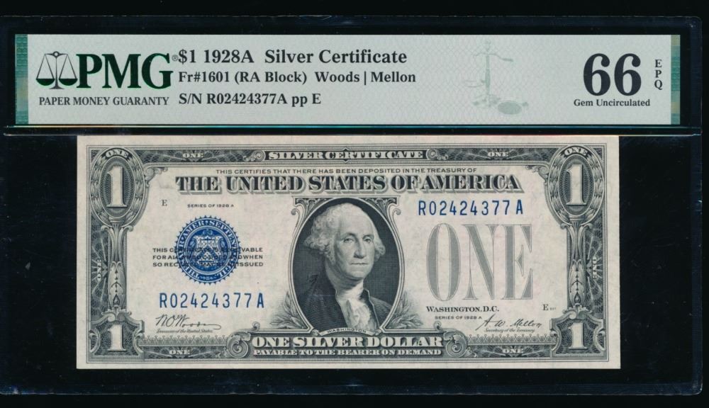 One 1928A $1 Silver Certificate PMG 66EPQ.
