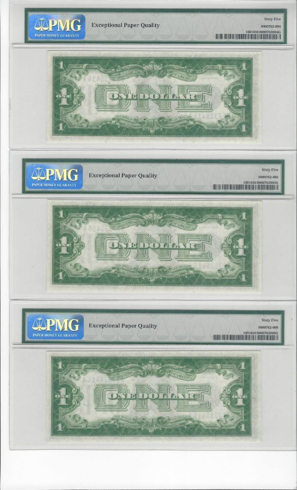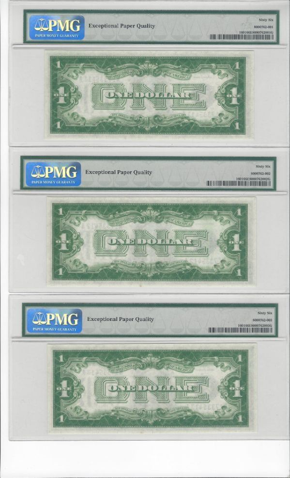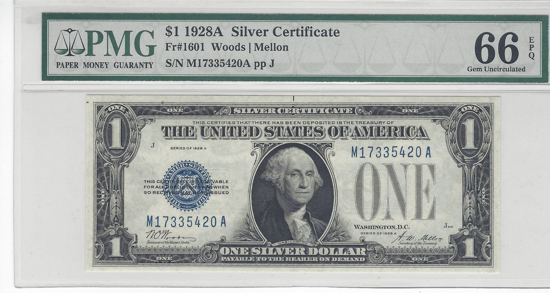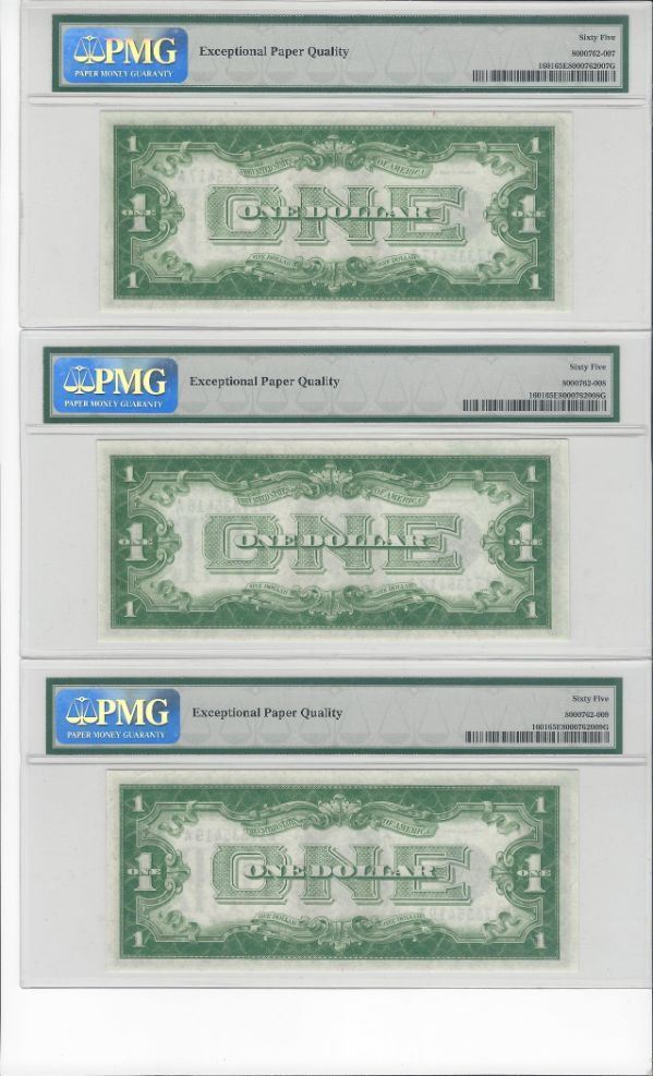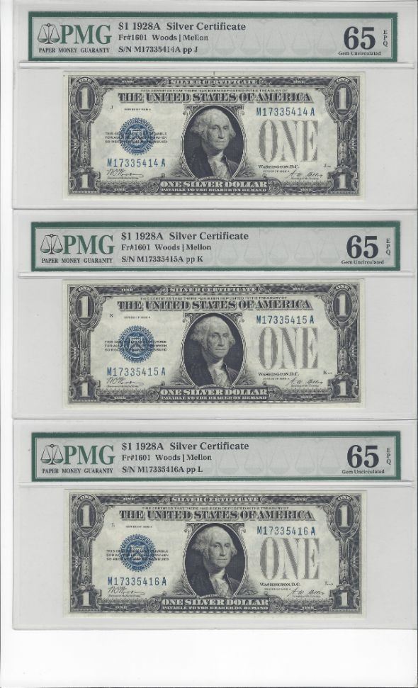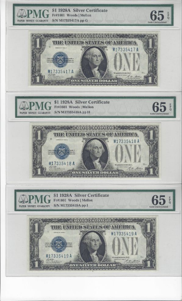 Excellent 10 consecutive run of 1928A Silver Certificates. Graded PMG 66 and 65 EPQ Gem Uncirculated. The notes are perfectly centered and the ink pops off the note.