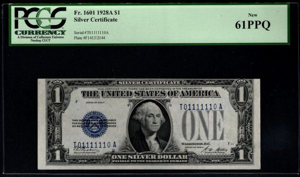 1928A $1 Super Radar Binary Serial Silver Certificate PCGS 61PPQ