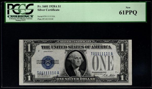 One 1928A $1 Super Radar Binary Serial Silver Certificate PCGS 61PPQ.