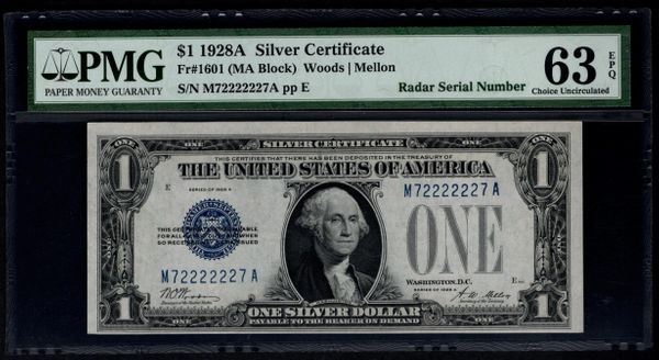1928A $1 Super Radar Binary Serial Silver Certificate PMG 63EPQ