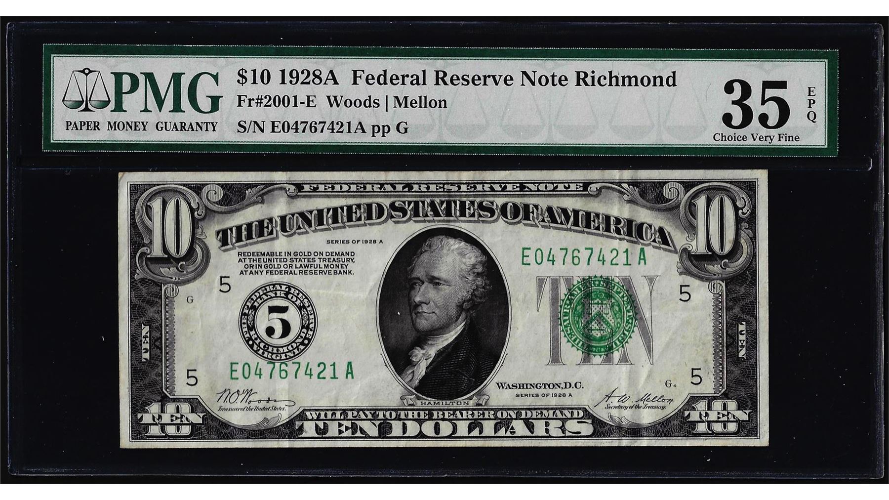 One 1928A $10 Federal Reserve Note Richmond Fr.2001-E PMG Choice Very Fine 35EPQ. PMG Certified.