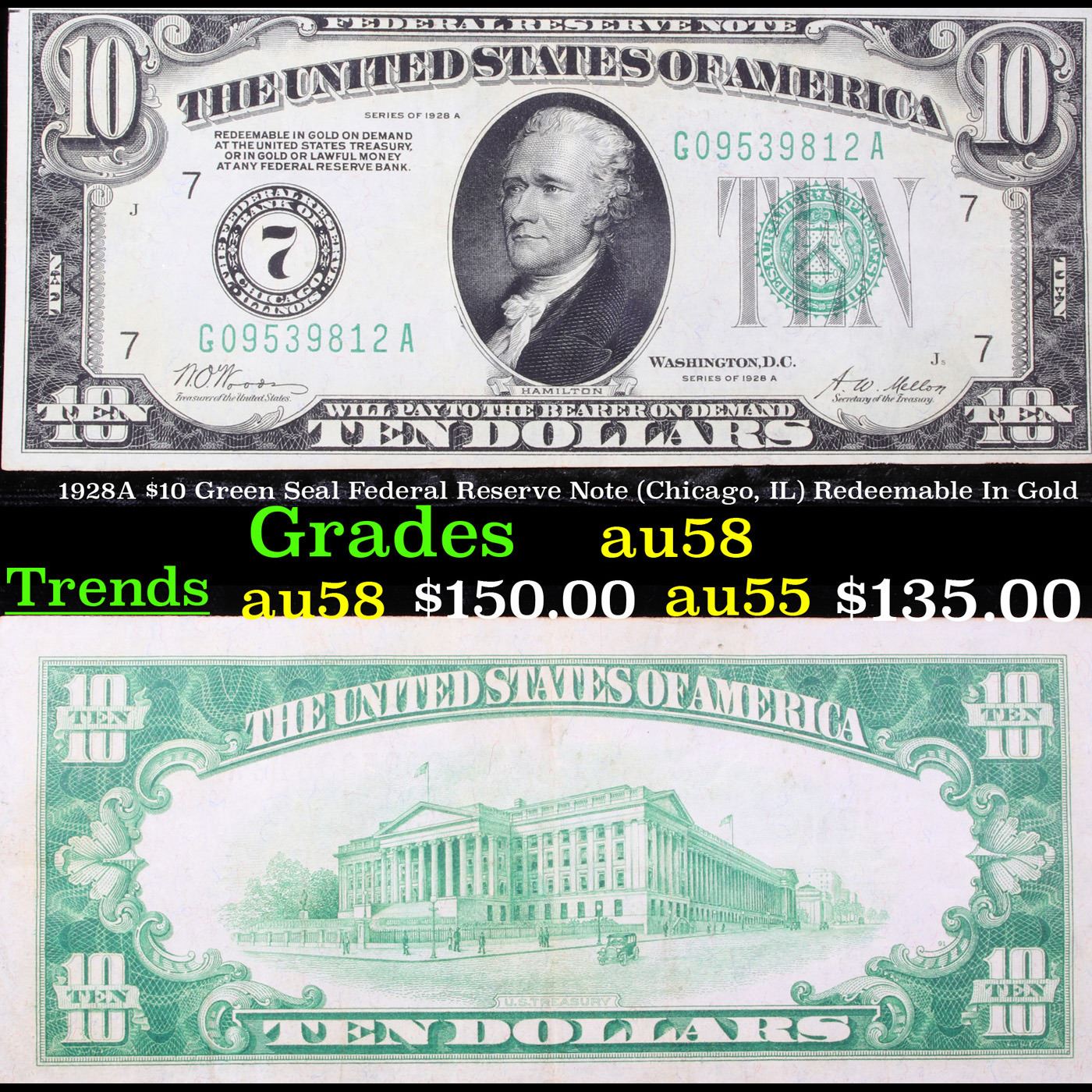 1928A $10 Green Seal Federal Reserve Note (Chicago, IL) Redeemable In Gold Grades Choice AU/BU Slide