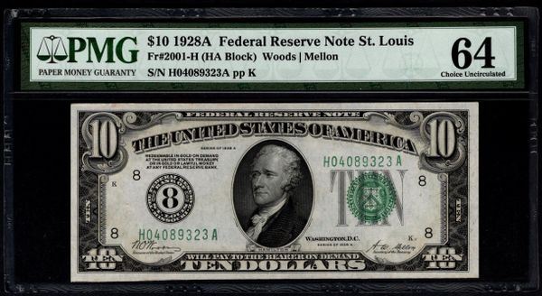 One 1928A $10 St Louis Federal Reserve Note PMG 64.