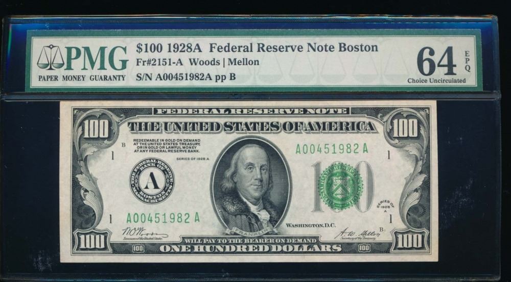 One 1928A $100 Boston Federal Reserve Note PMG 64EPQ.