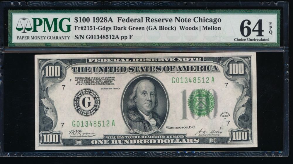 One 1928A $100 Chicago Federal Reserve Note PMG 64EPQ.