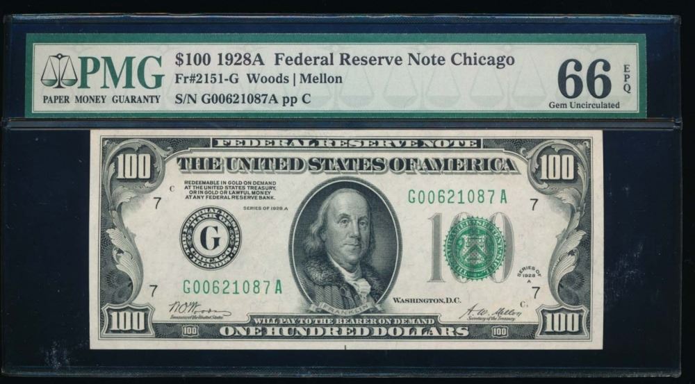 One 1928A $100 Chicago Federal Reserve Note PMG 66EPQ.