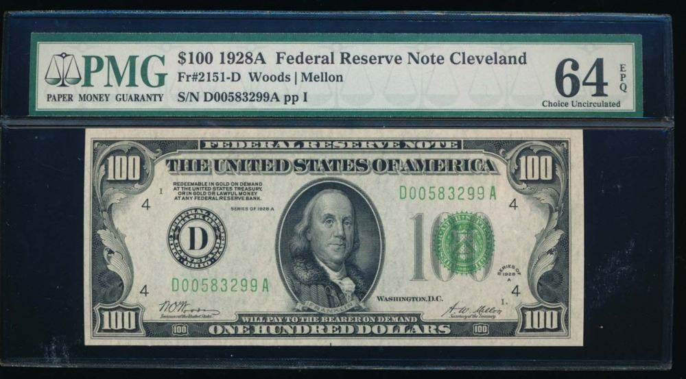 One 1928A $100 Cleveland Federal Reserve Note PMG 64EPQ.