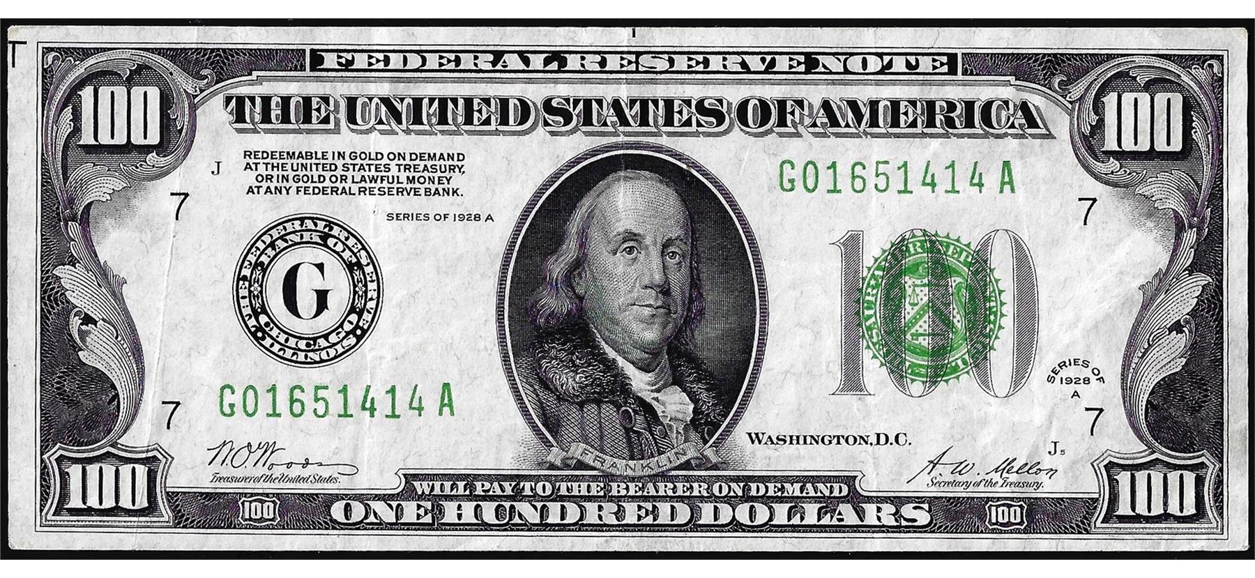 One 1928A $100 Federal Reserve Note Chicago Redeemable in Gold.