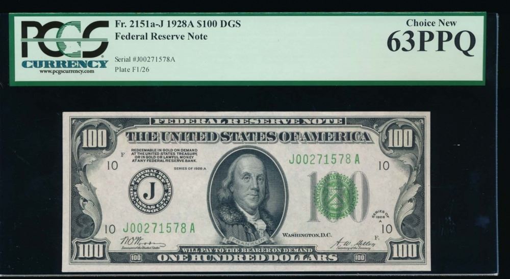 One 1928A $100 Kansas City Federal Reserve Note PCGS 63PPQ.