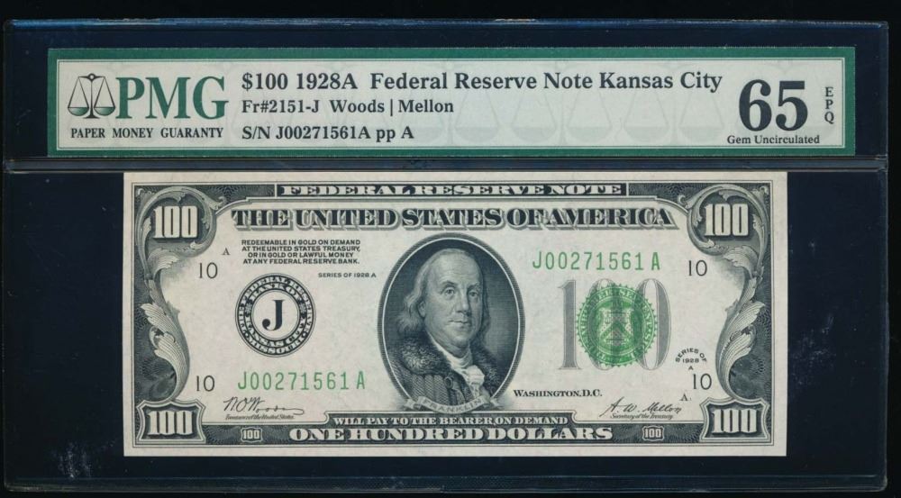 One 1928A $100 Kansas City Federal Reserve Note PMG 65EPQ.
