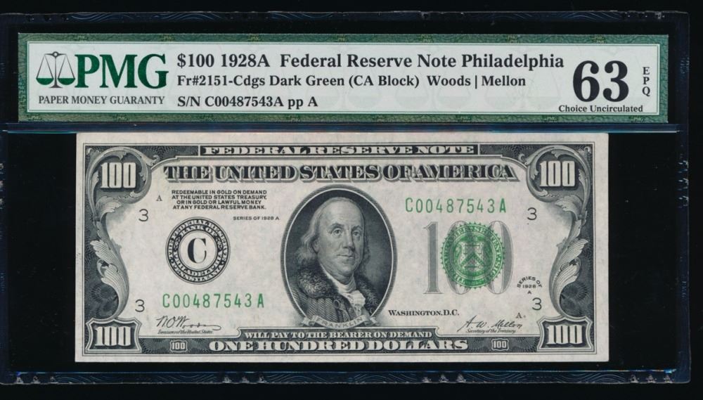 One 1928A $100 Philadelphia Federal Reserve Note PMG 63EPQ.