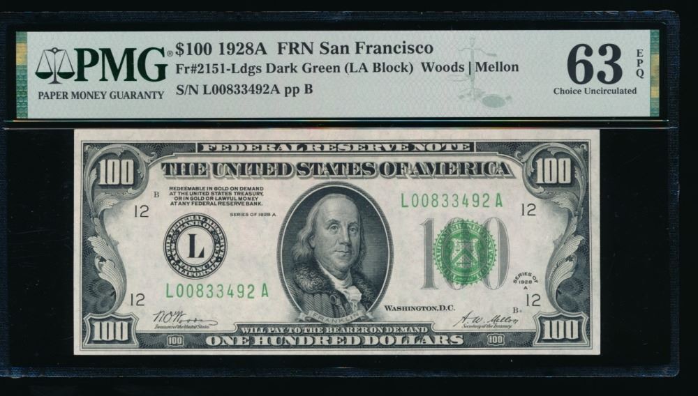 One 1928A $100 San Francisco FRN PMG 63EPQ.
