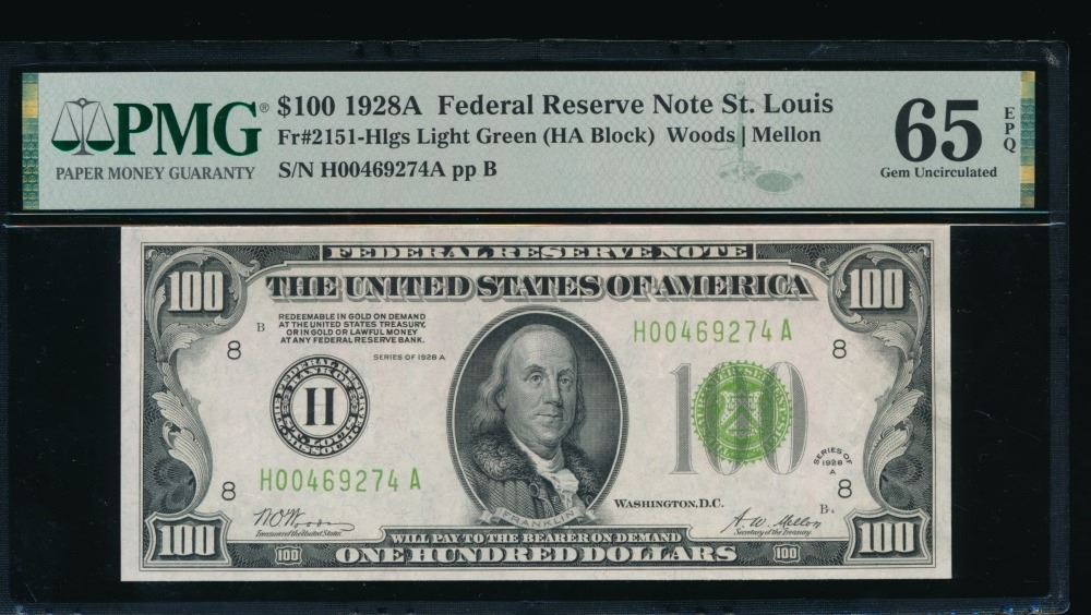 One 1928A $100 St Louis FRN PMG 65EPQ.