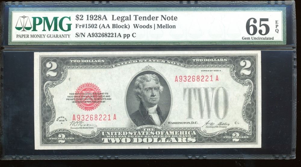One 1928A $2 Legal Tender Note PMG 65EPQ.