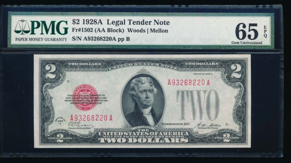 One 1928A $2 Legal Tender Note PMG 65EPQ.