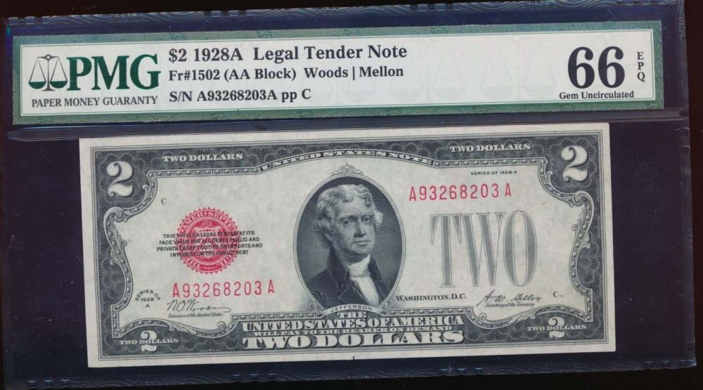 One 1928A $2 Legal Tender Note PMG 66EPQ.