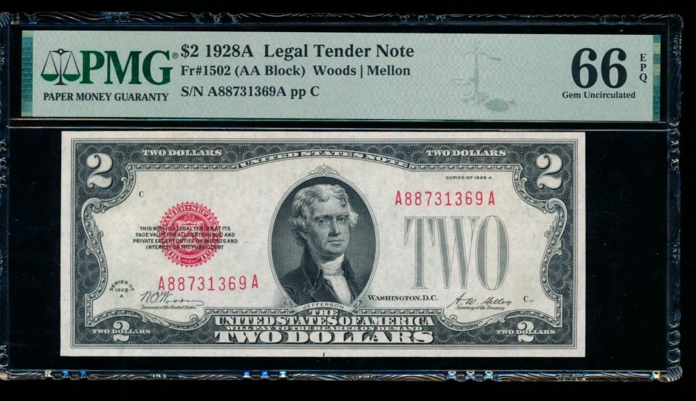 One 1928A $2 Legal Tender Note PMG 66EPQ.