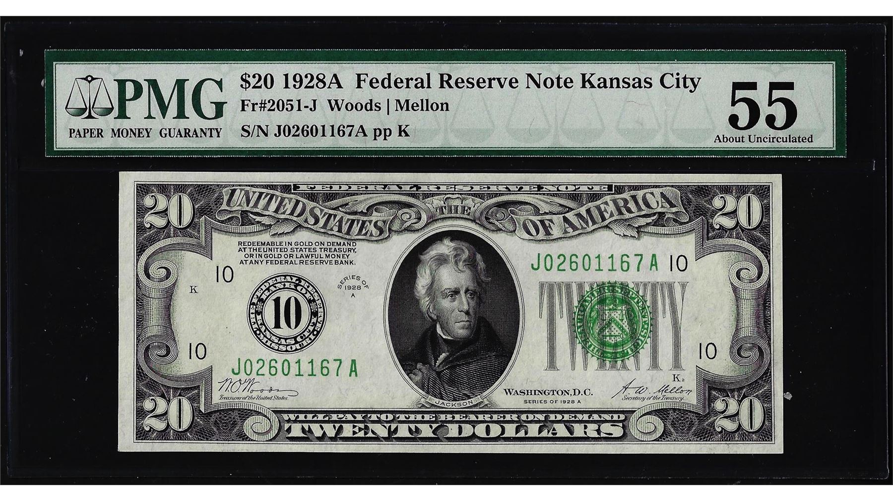 One 1928A $20 Federal Reserve Note Kansas City Fr.2051-J PMG About Uncirculated 55. PMG Certified.