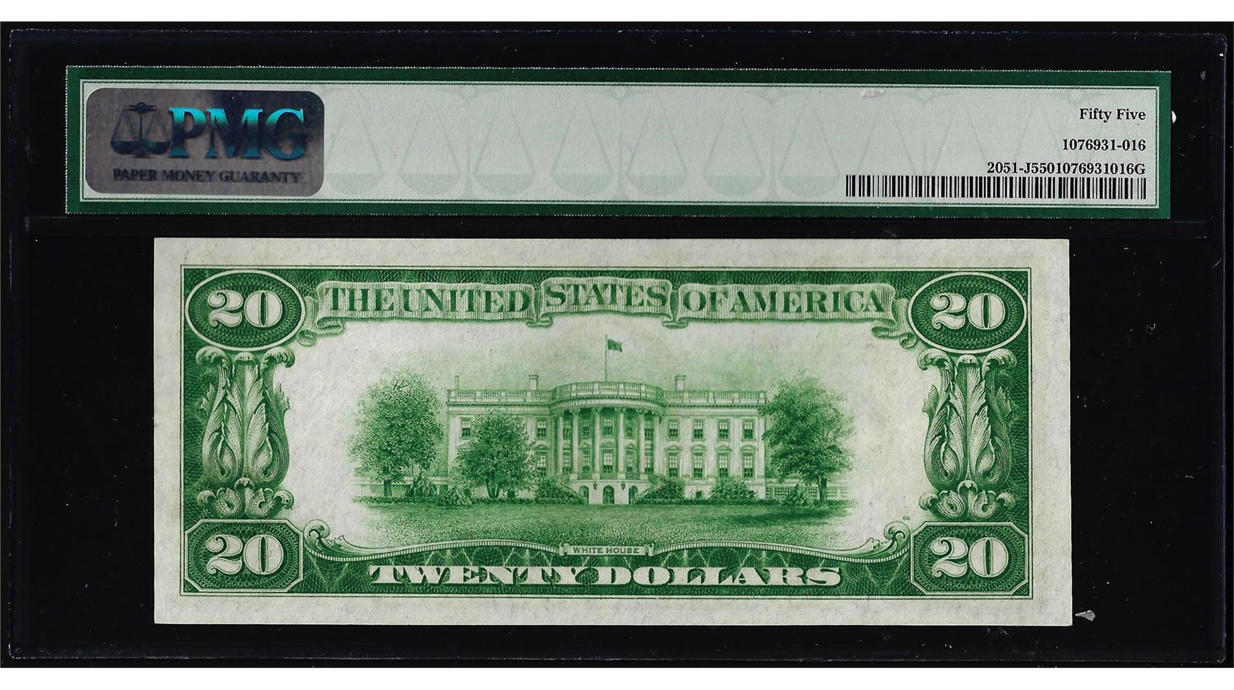 One 1928A $20 Federal Reserve Note Kansas City Fr.2051-J PMG About Uncirculated 55. PMG Certified.