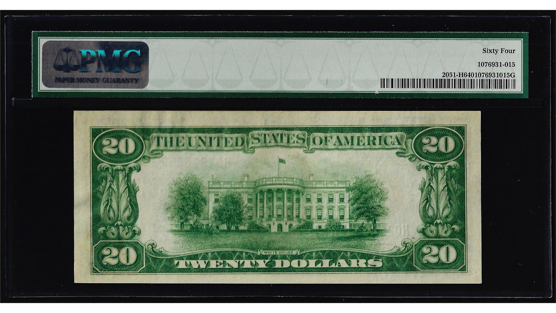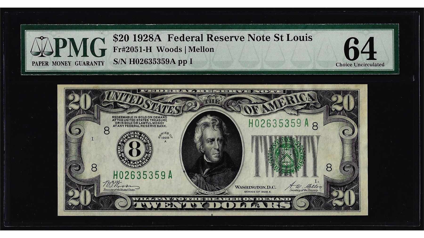 One 1928A $20 Federal Reserve Note St. Louis Fr.2051-H PMG Choice Uncirculated 64. PMG Certified.