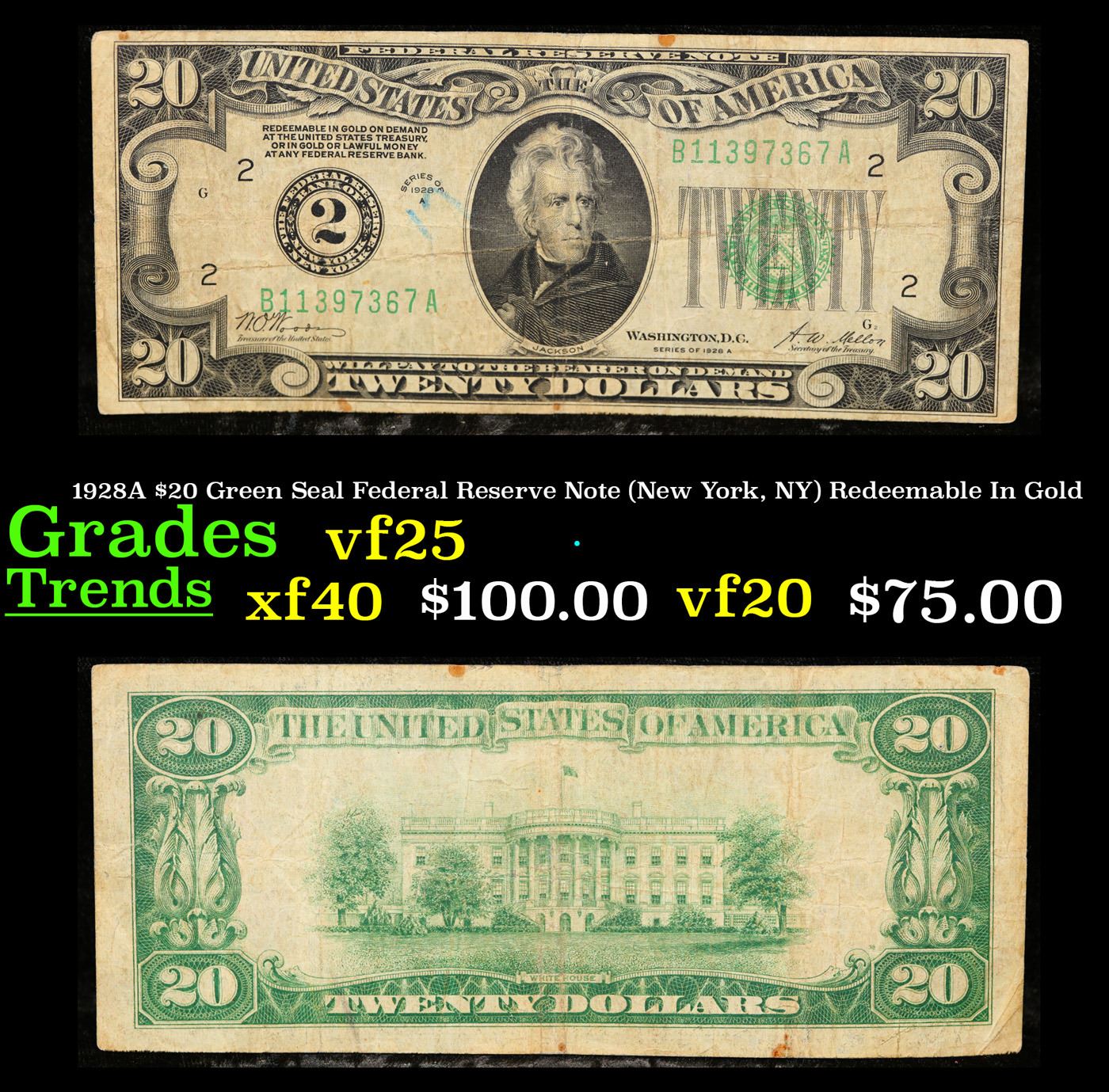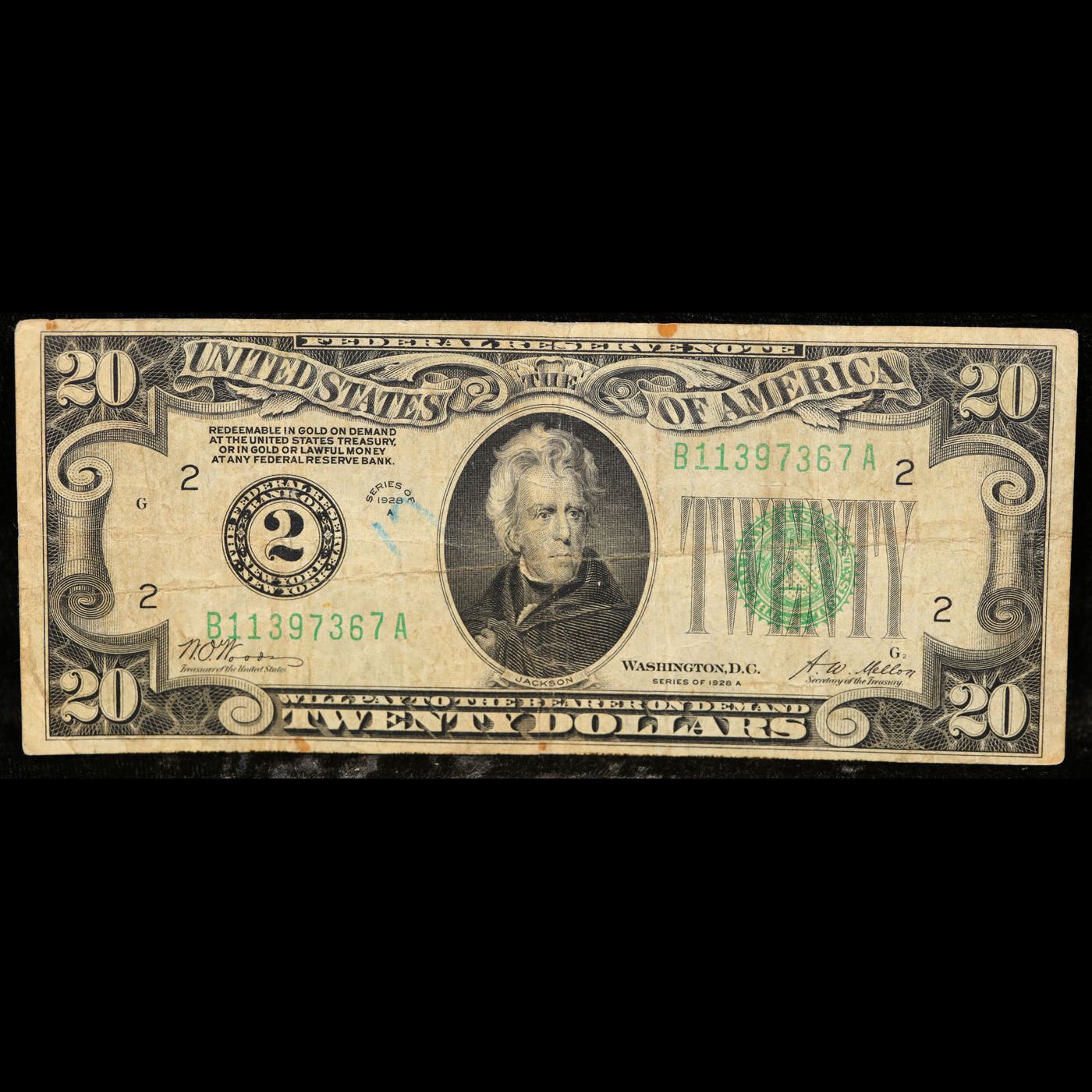 1928A $20 Green Seal Federal Reserve Note (New York, NY) Redeemable In Gold Grades vf+