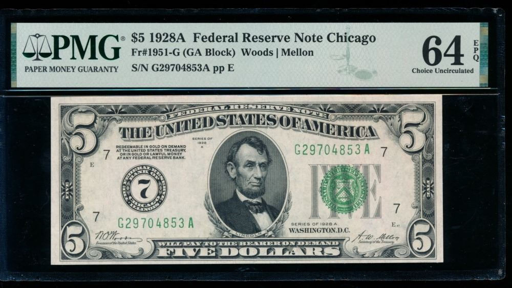 One 1928A $5 Chicago FRN PMG 64EPQ.