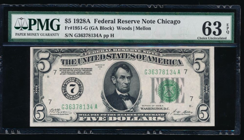 One 1928A $5 Chicago Federal Reserve Note PMG 63EPQ.