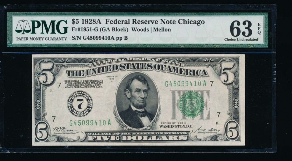 One 1928A $5 Chicago Federal Reserve Note PMG 63EPQ.