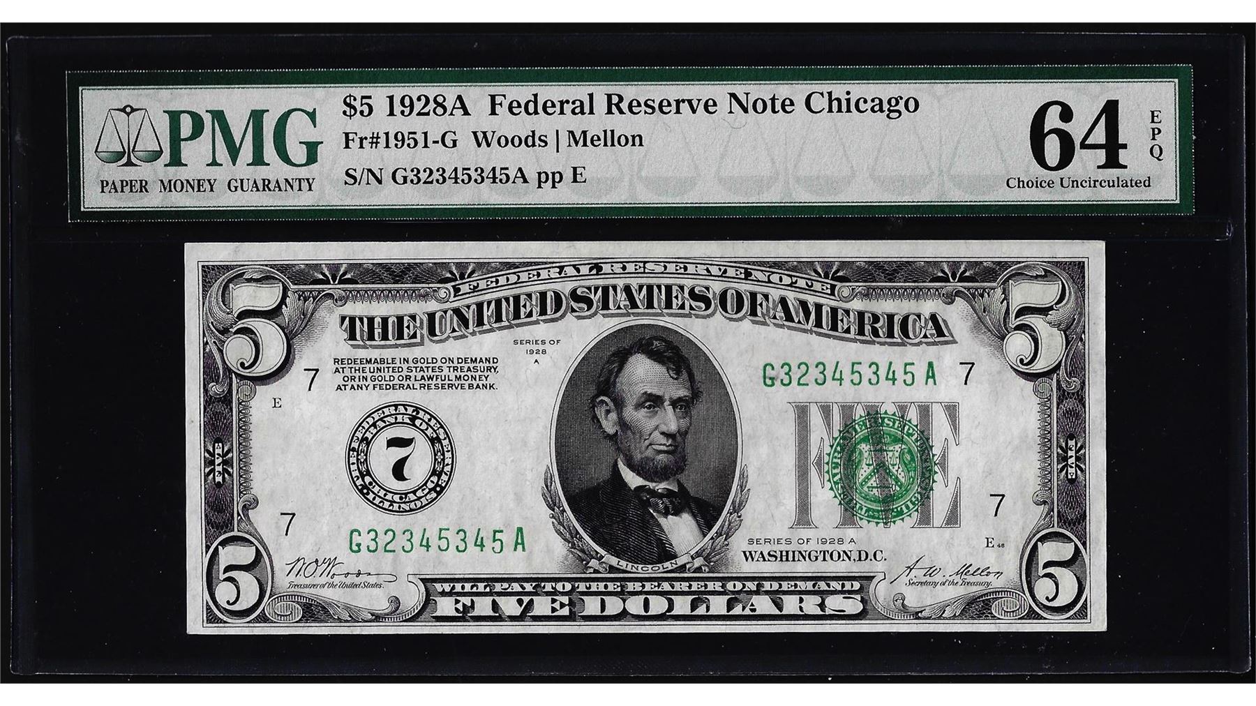 One 1928A $5 Federal Reserve Note Chicago Fr.1951-G PMG Choice Uncirculated 64EPQ. PMG Certified.