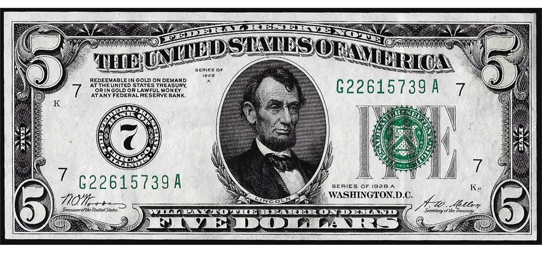 One 1928A $5 Federal Reserve Note Chicago.