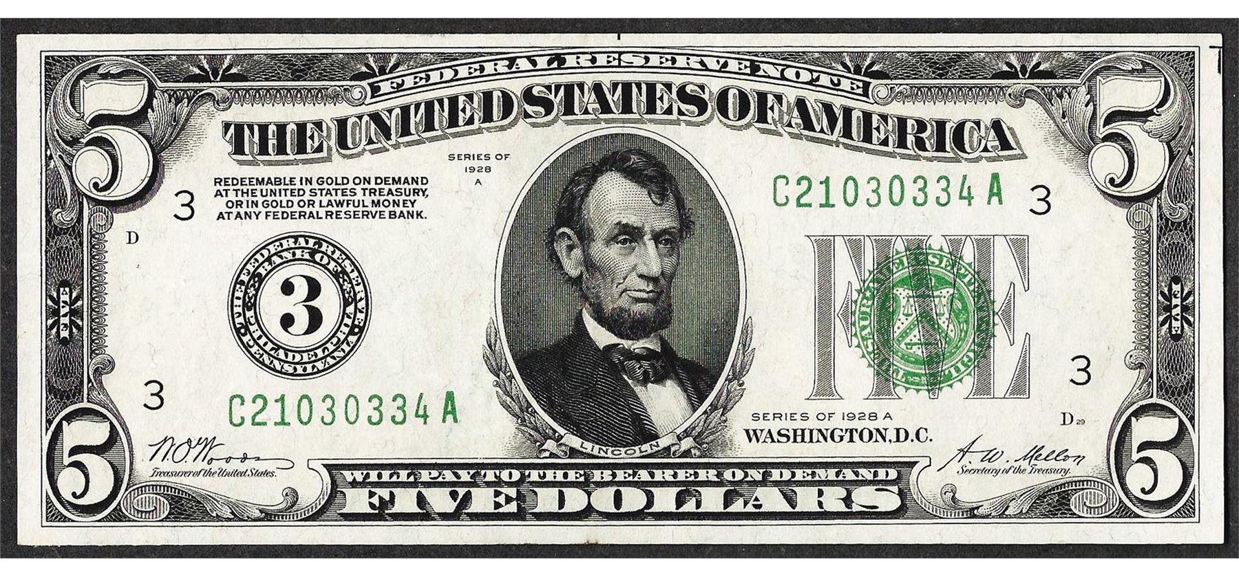 One 1928A $5 Federal Reserve Note Philadelphia.
