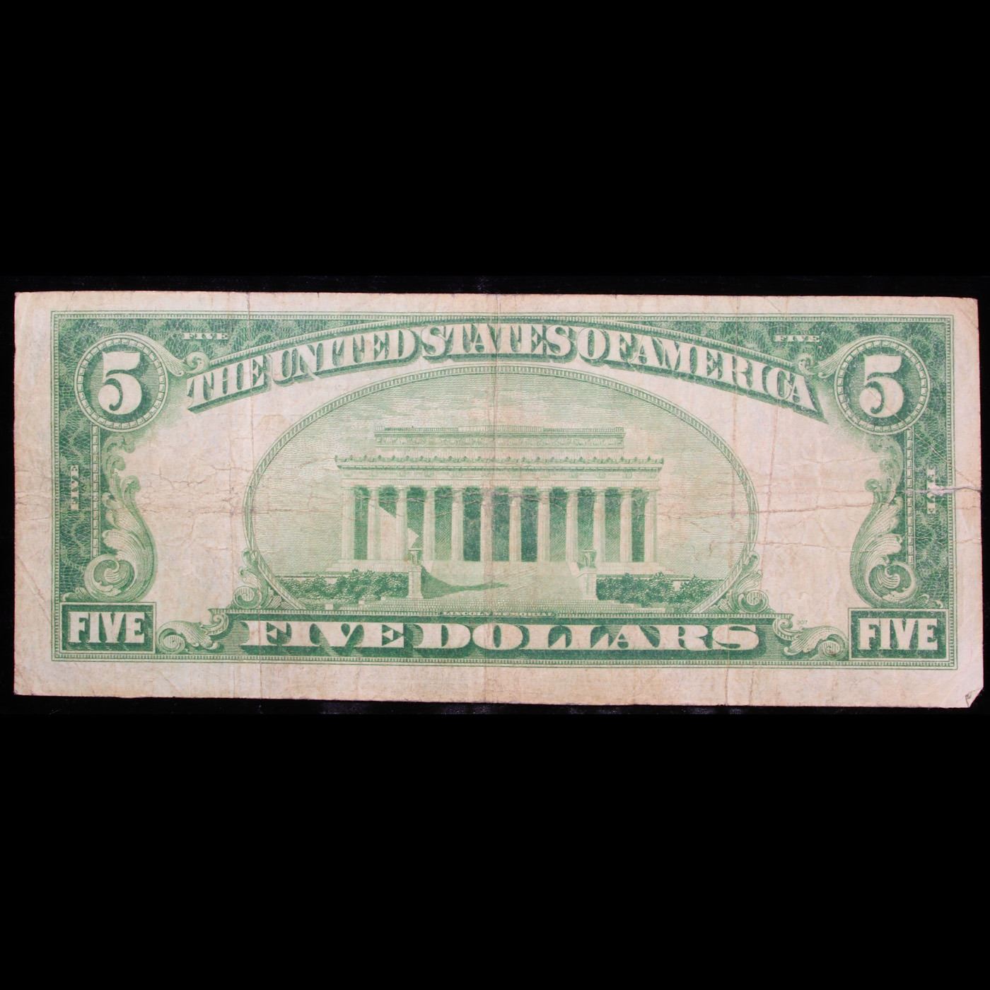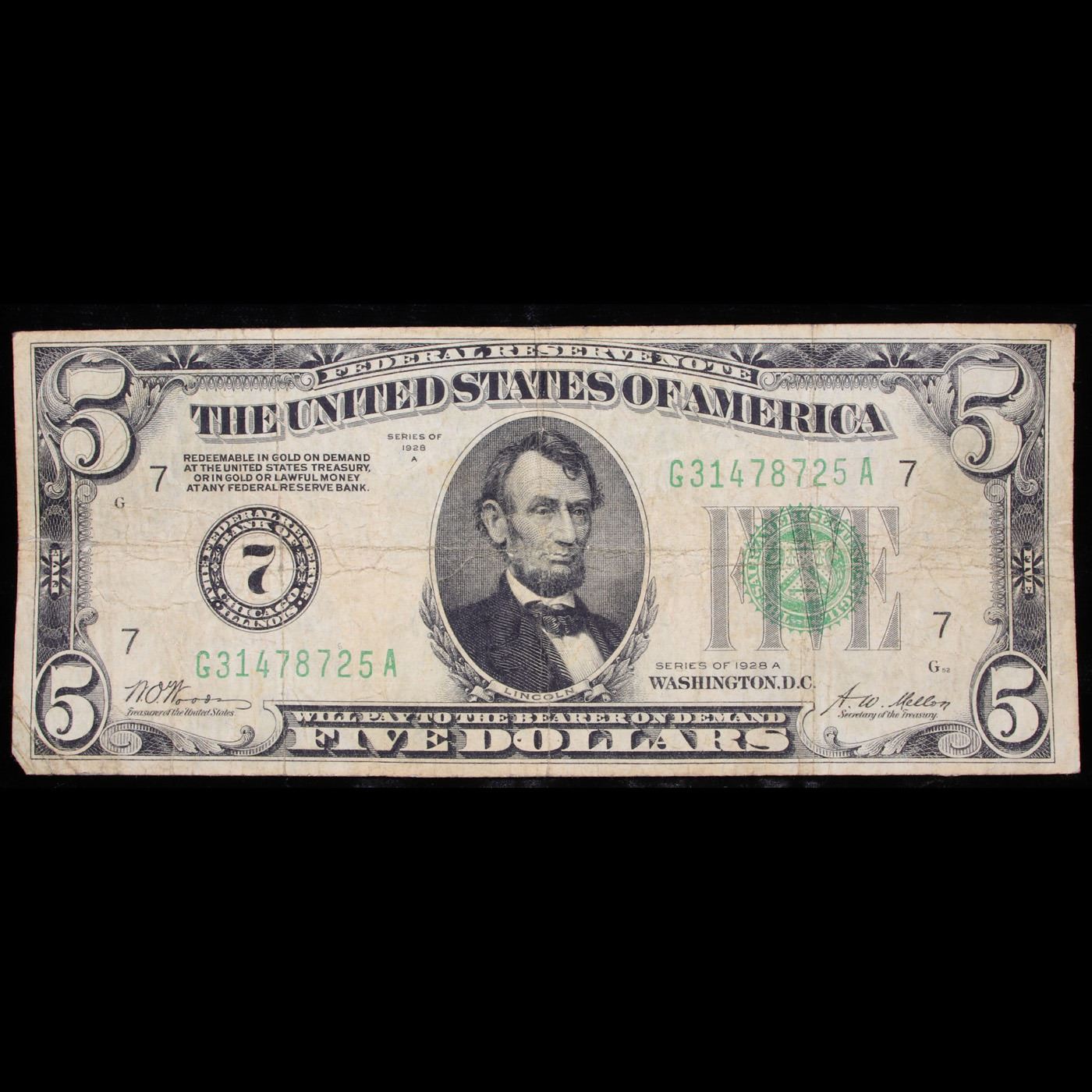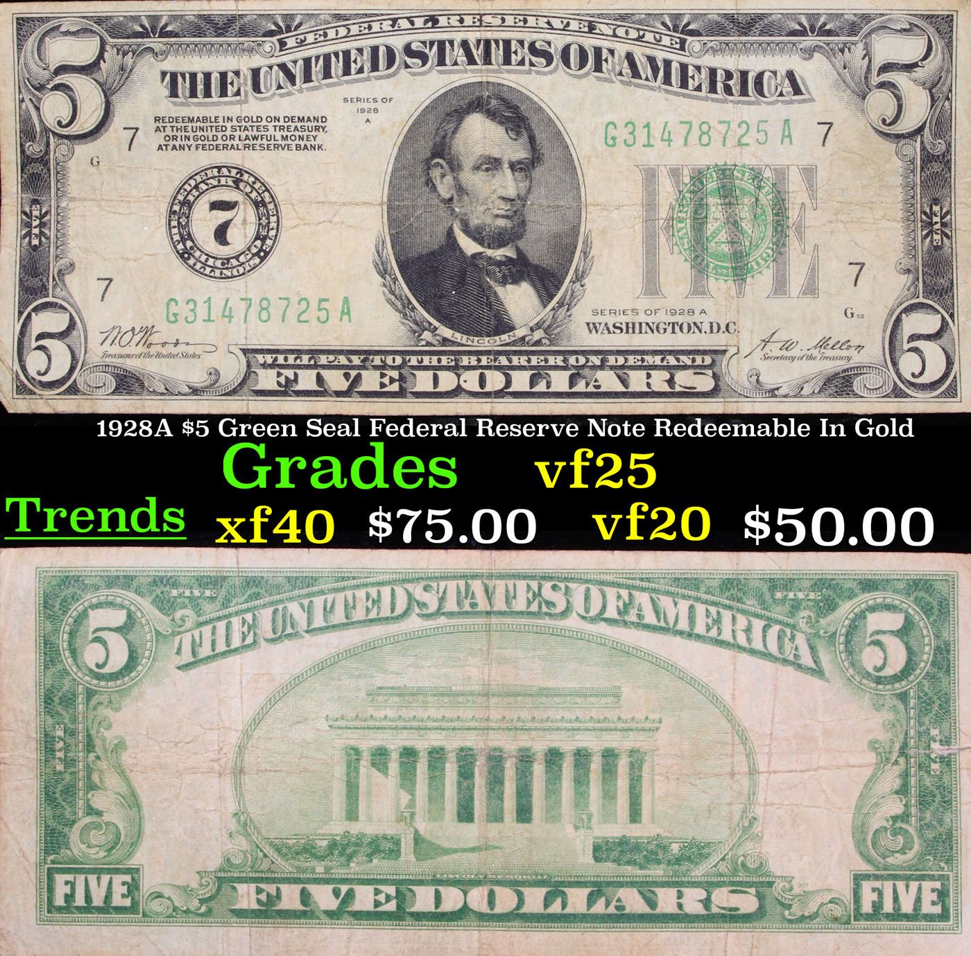1928A $5 Green Seal Federal Reserve Note Redeemable In Gold Grades vf+.
