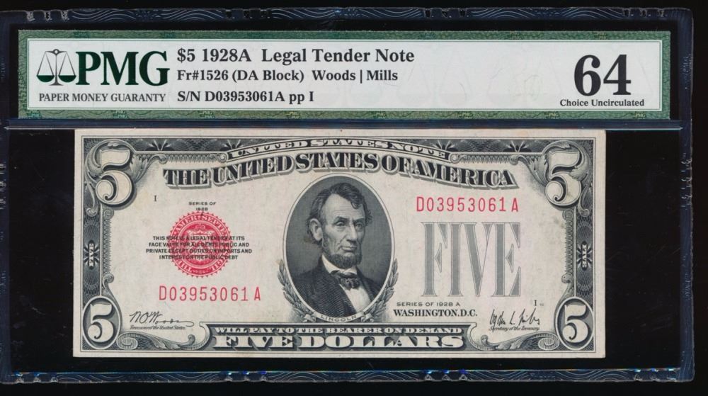 One 1928A $5 Legal Tender Note PMG 64.