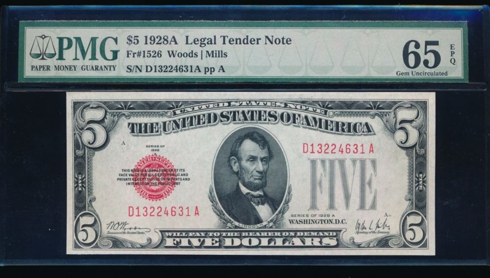 One 1928A $5 Legal Tender Note PMG 65EPQ.