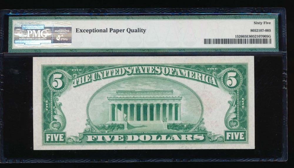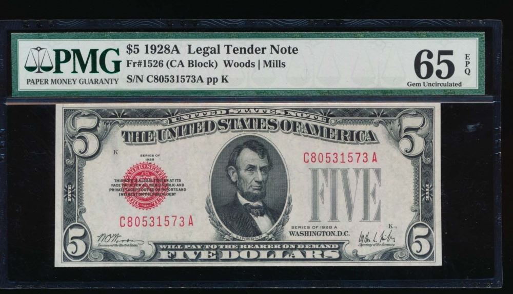 One 1928A $5 Legal Tender Note PMG 65EPQ.
