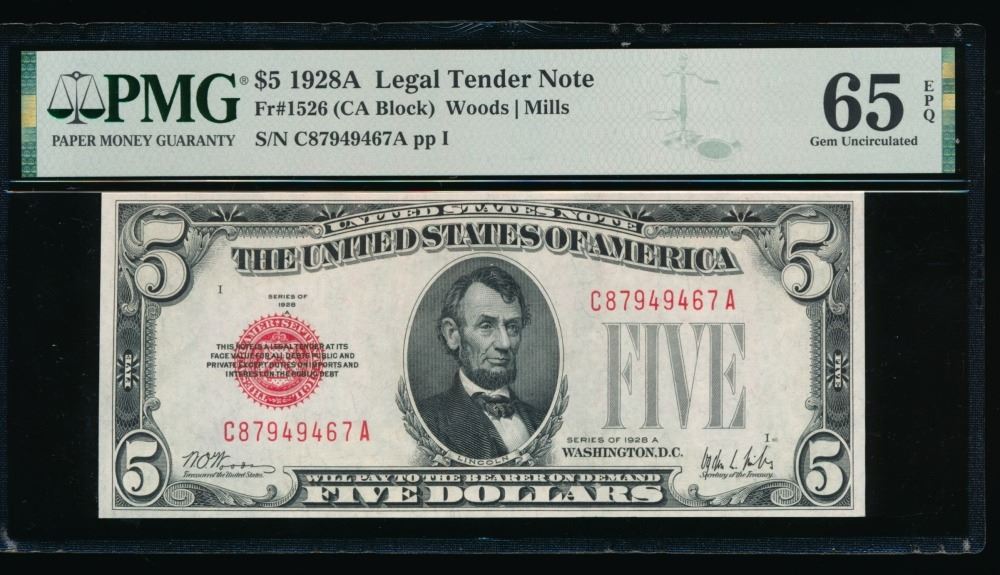 One 1928A $5 Legal Tender Note PMG 65EPQ.