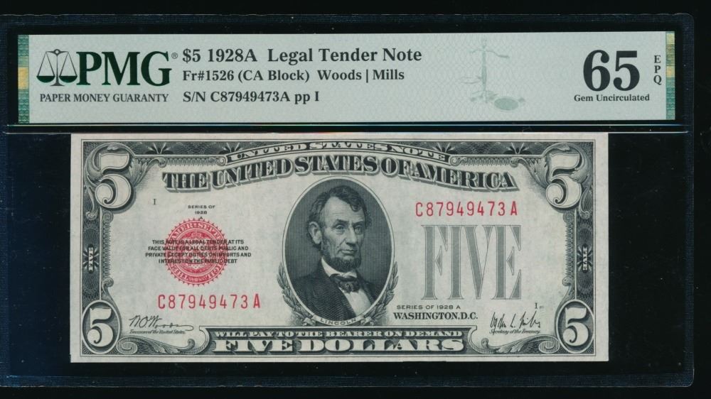 One 1928A $5 Legal Tender Note PMG 65EPQ.