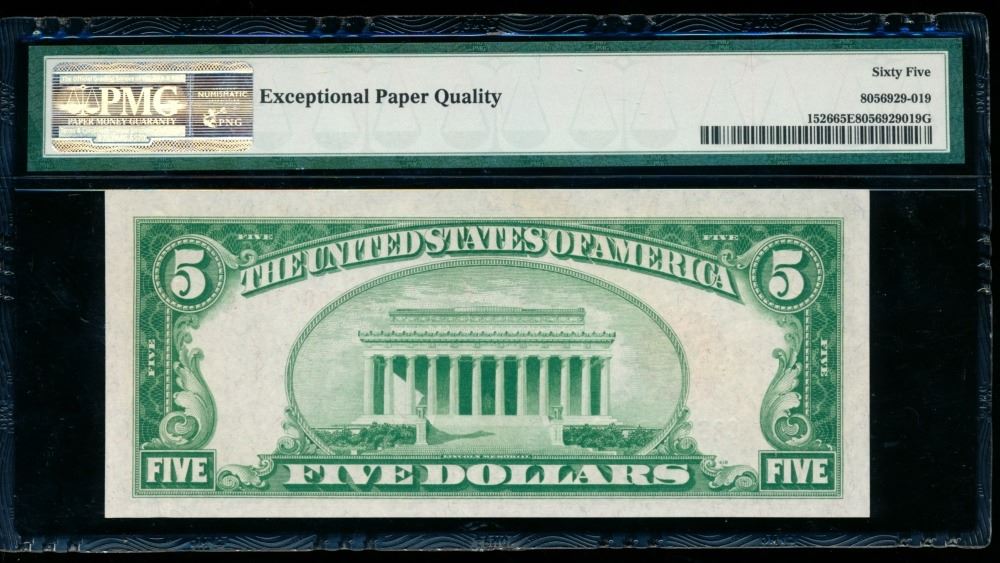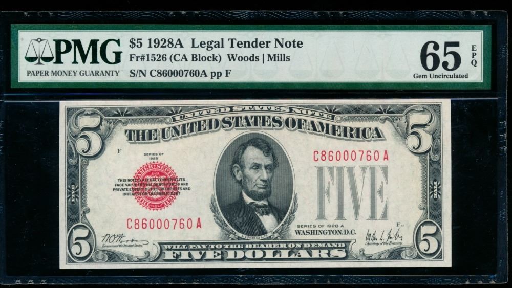 One 1928A $5 Legal Tender Note PMG 65EPQ.