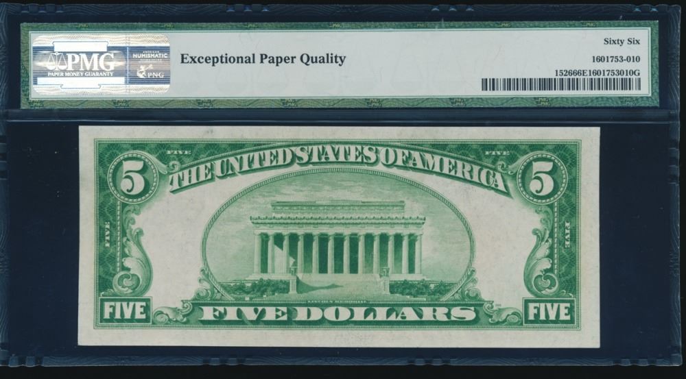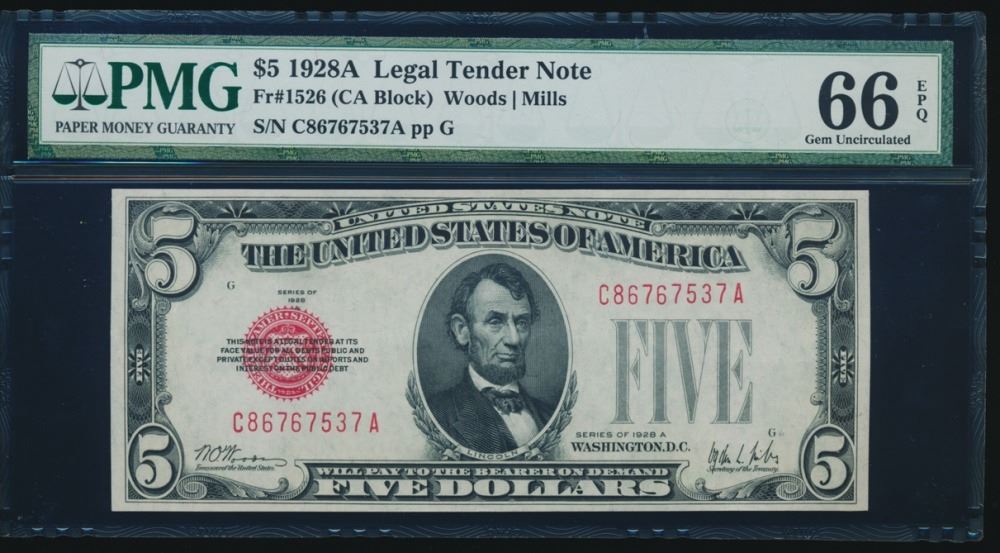 One 1928A $5 Legal Tender Note PMG 66EPQ.