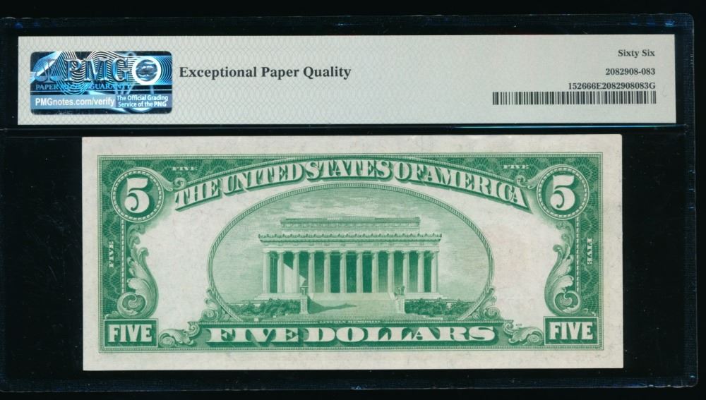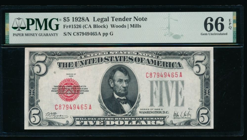 One 1928A $5 Legal Tender Note PMG 66EPQ.