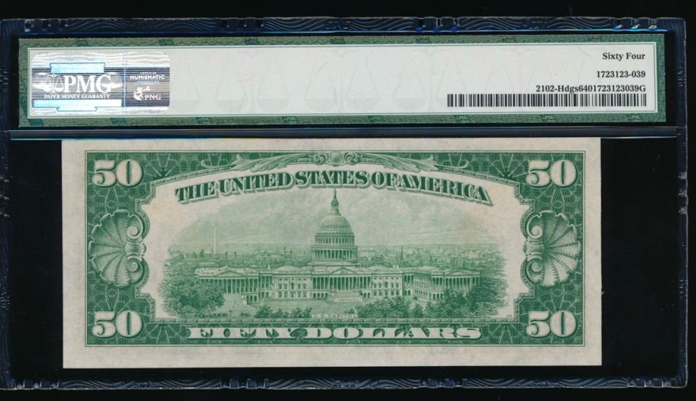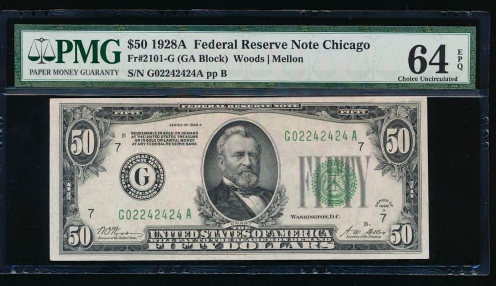 One 1928A $50 Chicago Federal Reserve Note Fancy Serial Number PMG 64EPQ.