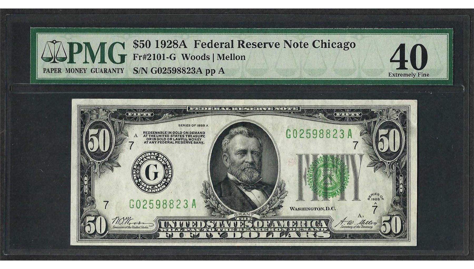 One 1928A $50 Federal Reserve Note Chicago Fr.2101-G PMG Extremely Fine 40. PMG Certified.