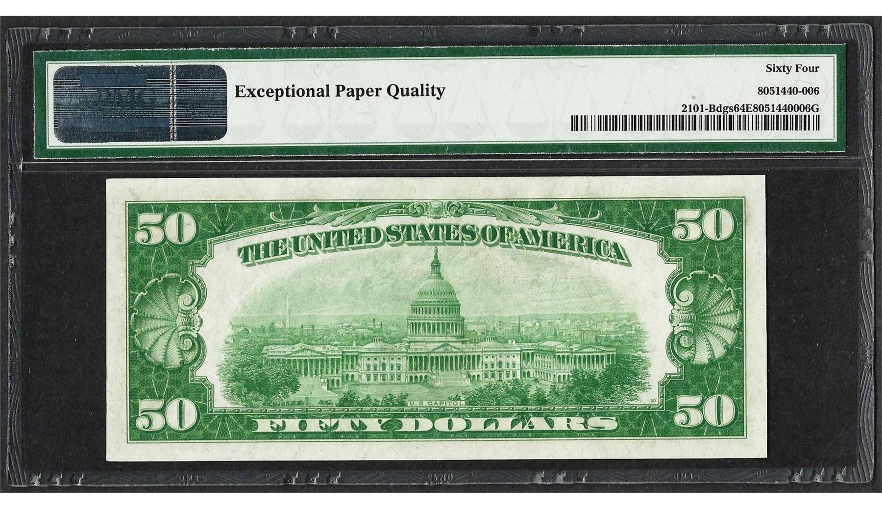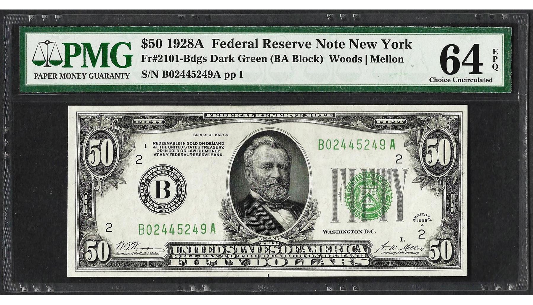 1928A $50 Federal Reserve Note Fr.2101-Bdgs PMG Choice Uncirculated 64EPQ