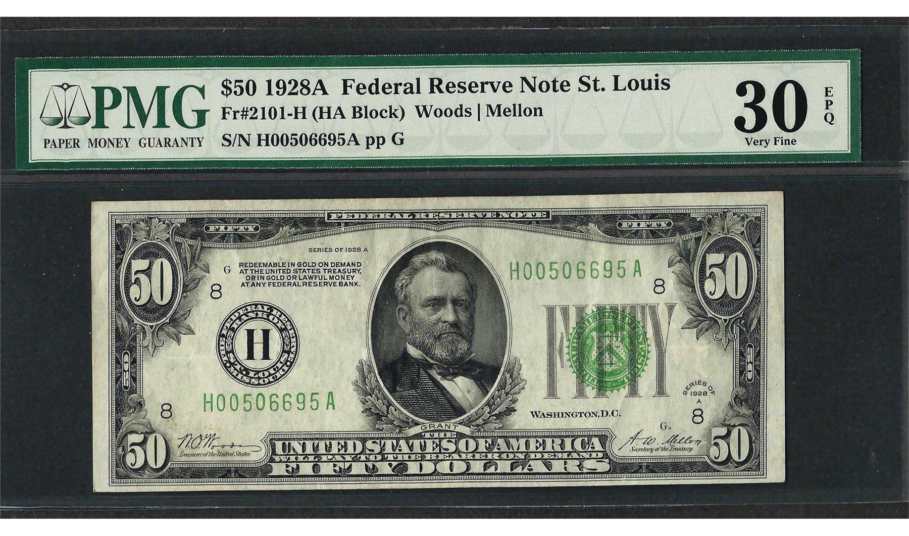 One 1928A $50 Federal Reserve Note St. Louis Fr.2101-H PMG Very Fine 30EPQ. PMG Certified.