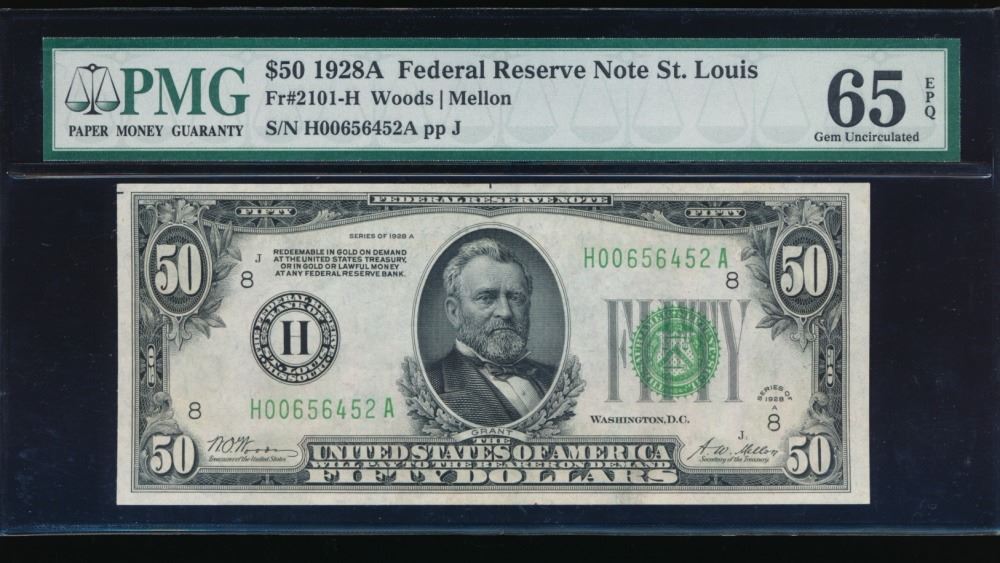 One 1928A $50 St. Louis Federal Reserve Note PMG 65EPQ.