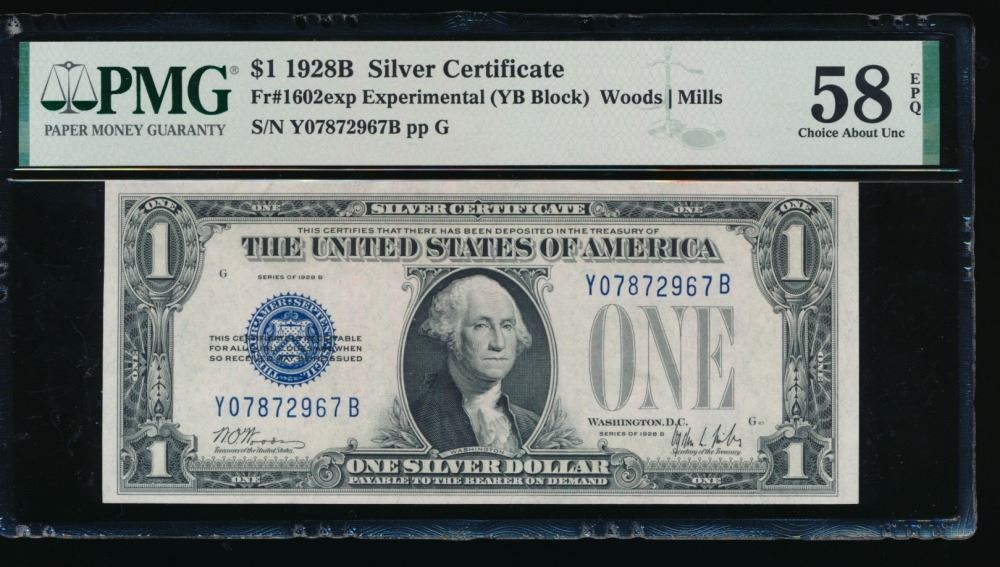 One 1928B $1 Experimental Silver Cert PMG 66EPQ.