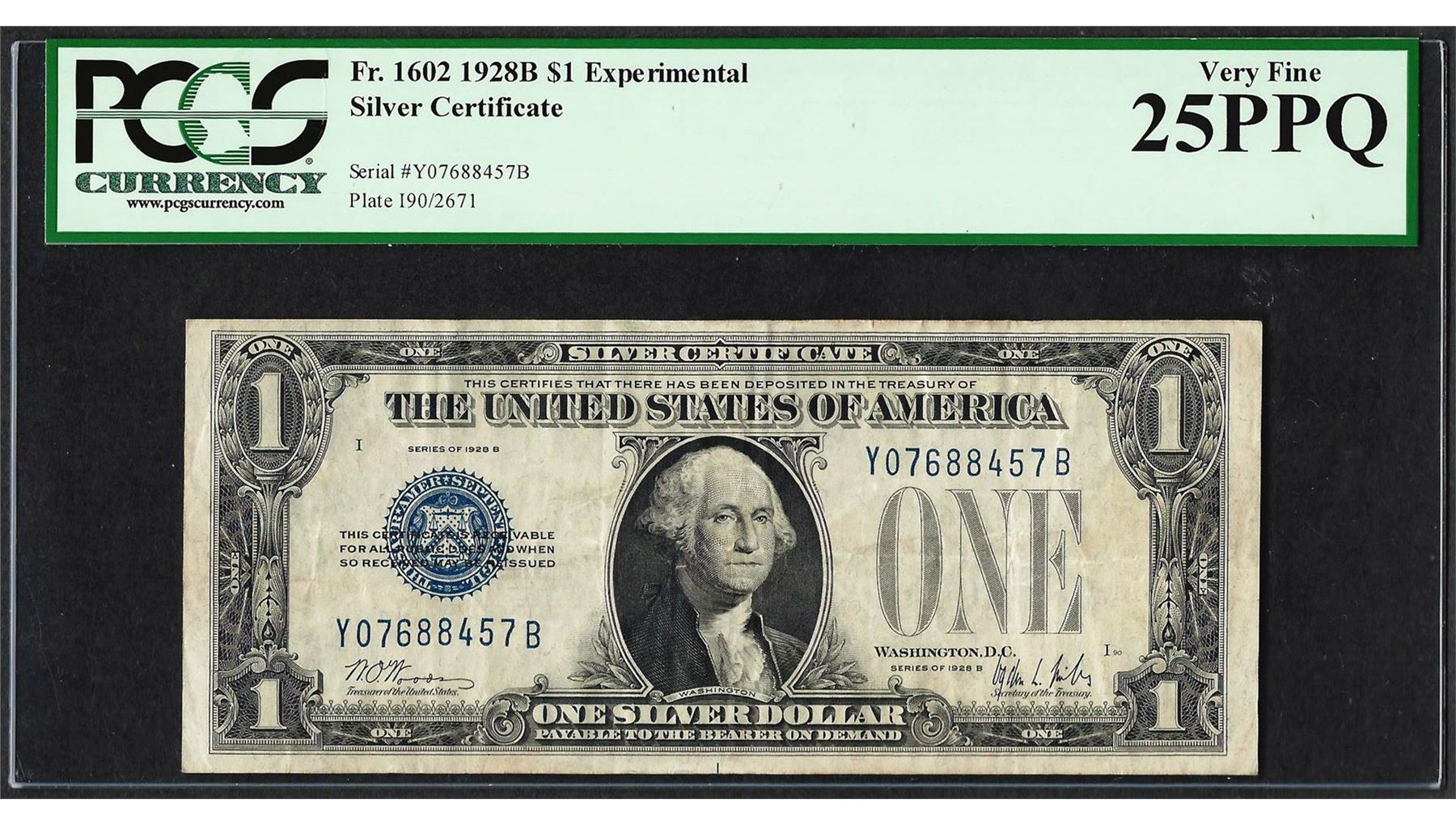 One 1928B $1 Experimental Silver Certificate Note Fr.1602 PCGS Very Fine 25PPQ. PCGS Graded.