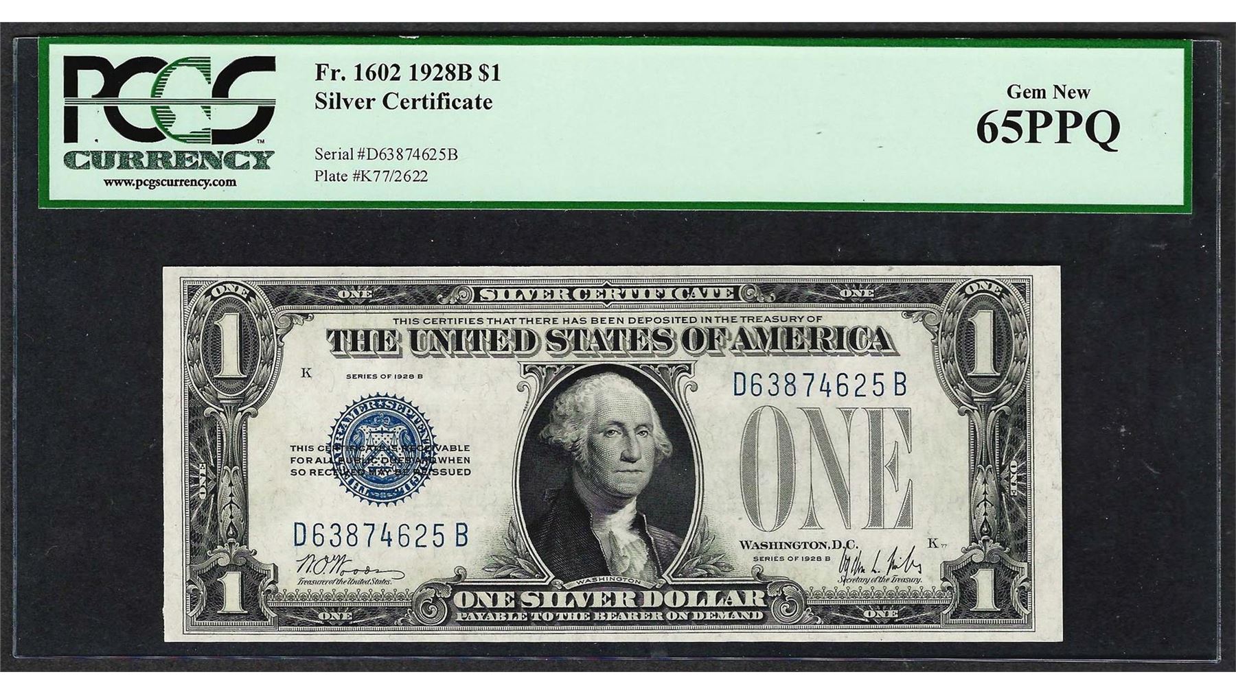 One 1928B $1 Funnyback Silver Certificate Note Fr.1602 PCGS Gem New 65PPQ. PCGS Graded.